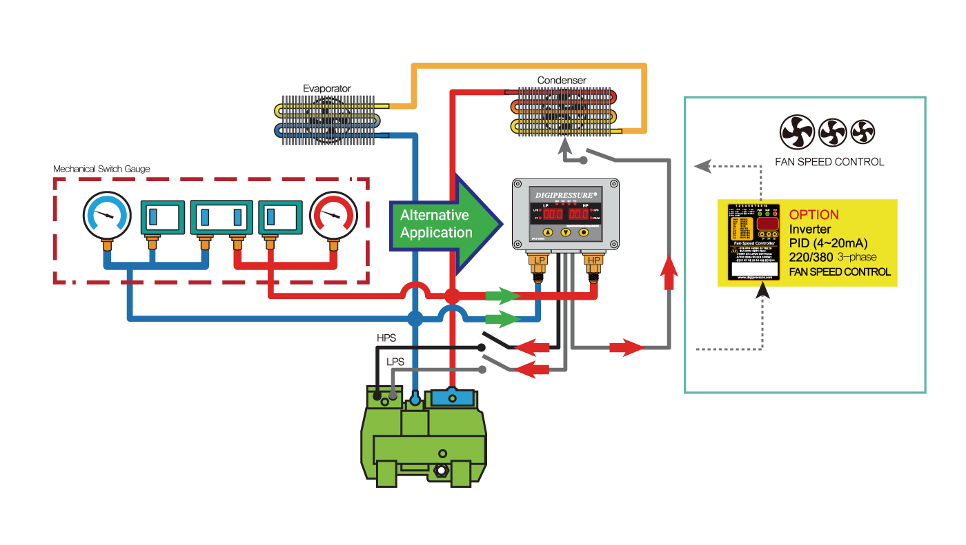 2 pressure sensors (low/high pressure) - Closed reciprocating/screw/scroll type chiller control - Low pressure 2 points, high pressure 2 points - Built-in low pressure ON/OFF, high pressure OFF delay timer - Set pressure value can be input in units of 0.1 kgf/cm2 - Pressure unit (kgf/㎠, Mpa, Bar, Psi) can be set